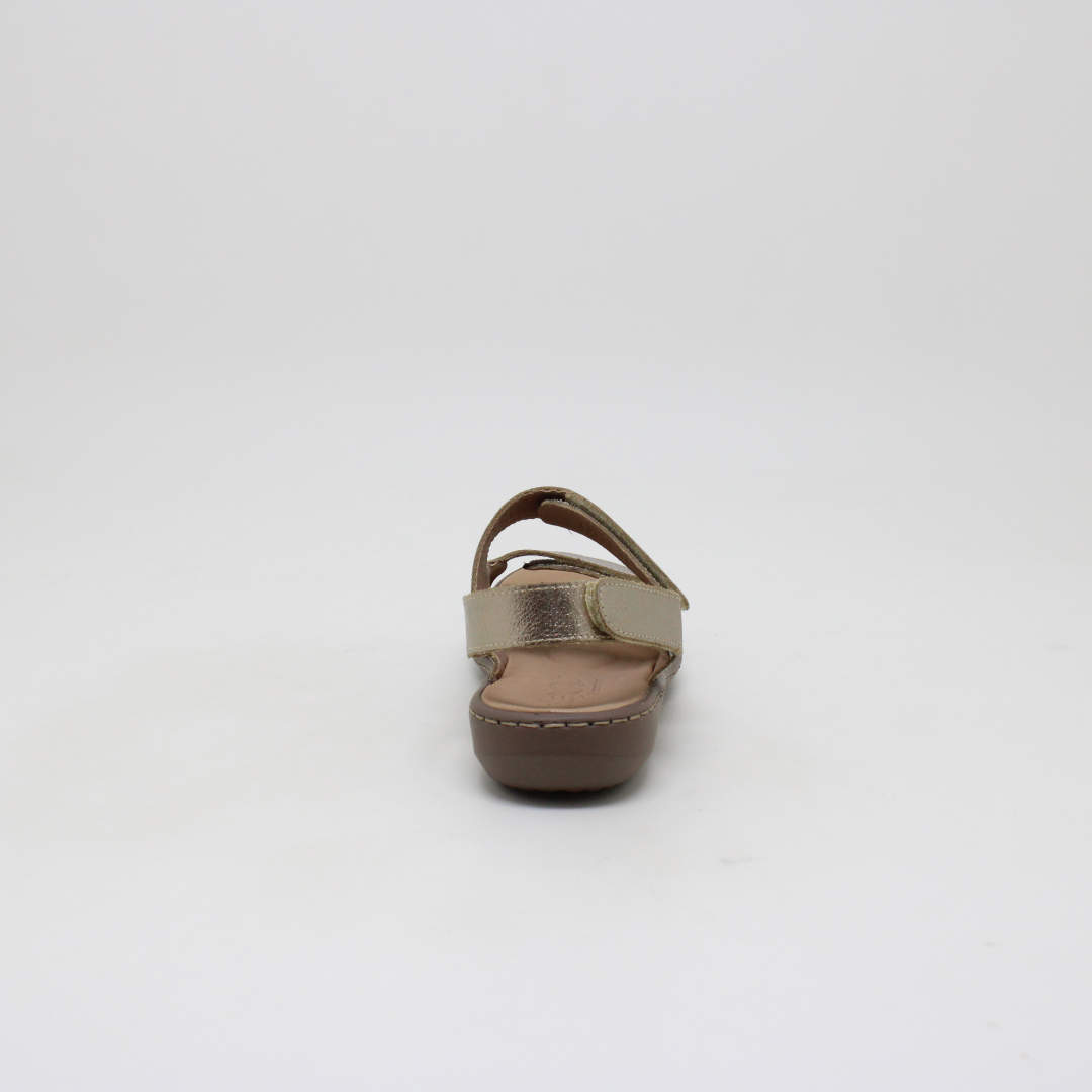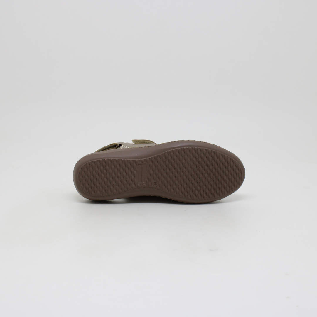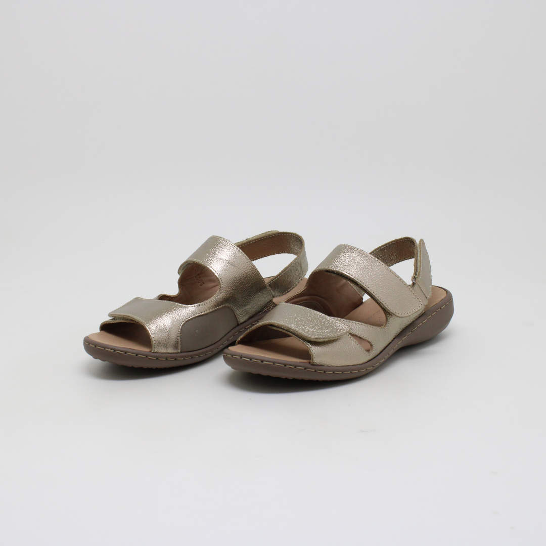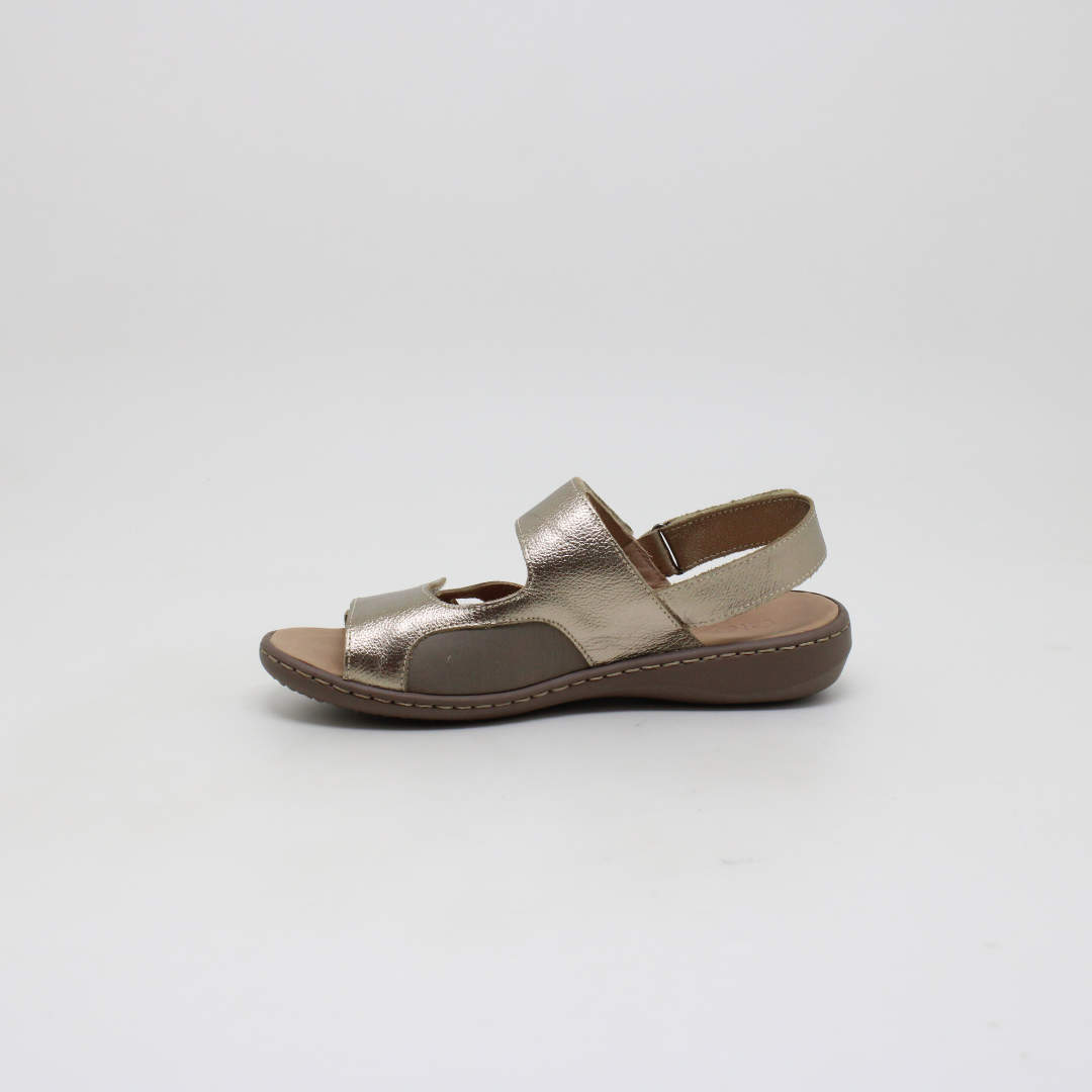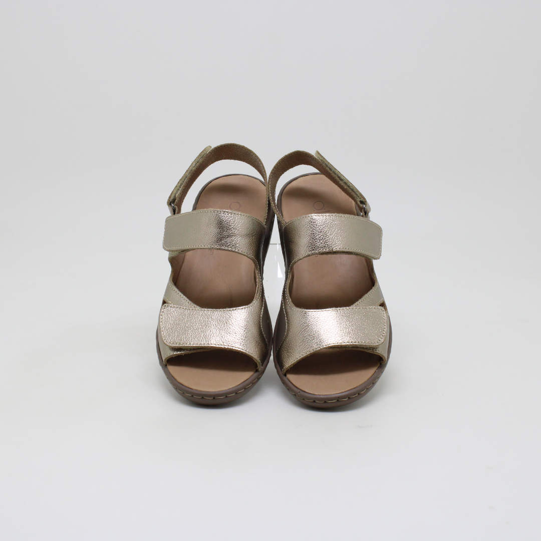 Sandália Opananken na cor prata velha, salto anabela baixo, confeccionado em couro legítimo muito macio. Forração interna toda em couro também. Calçado muito confortável.