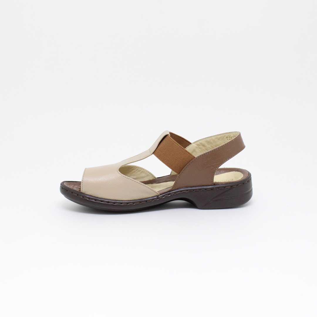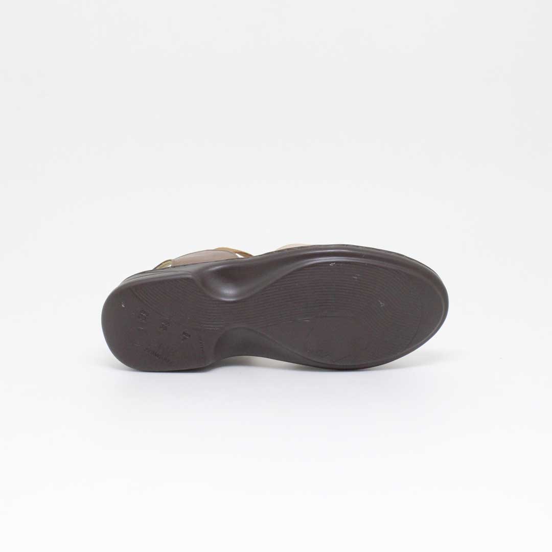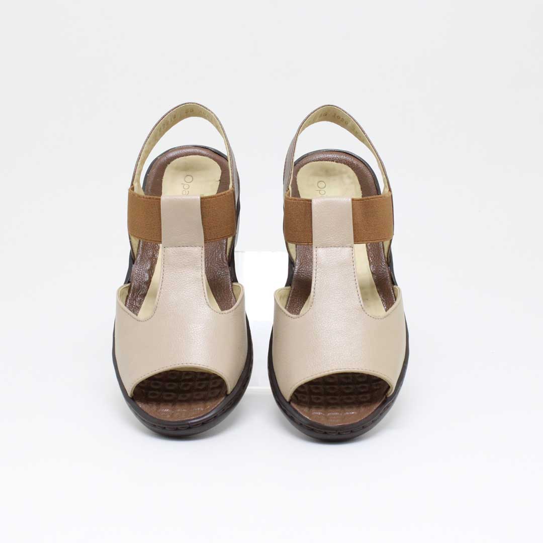 Sandália Opananken na cor amêndoa/linhaça, salto anabela baixo, confeccionado em couro legítimo muito macio. Forração interna toda em couro também. Calçado muito confortável.