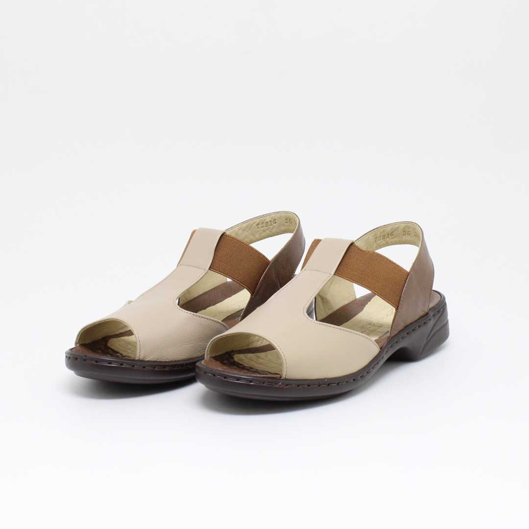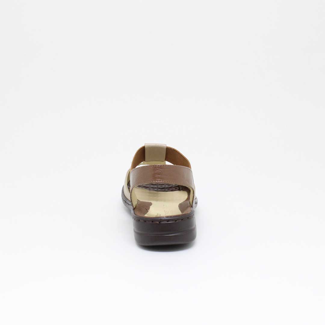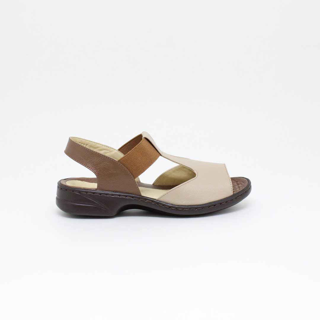 Sandália Opananken na cor amêndoa/linhaça, salto anabela baixo, confeccionado em couro legítimo muito macio. Forração interna toda em couro também. Calçado muito confortável.