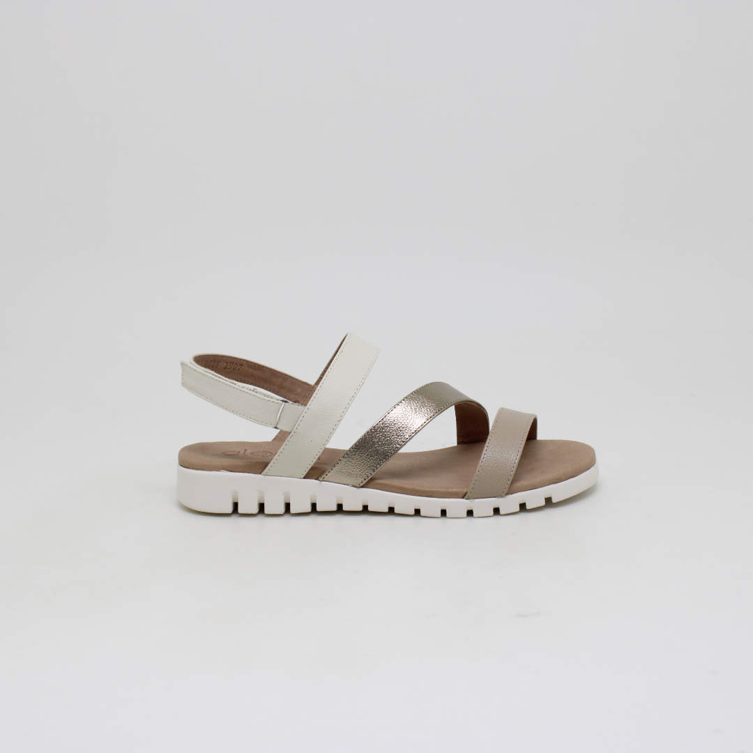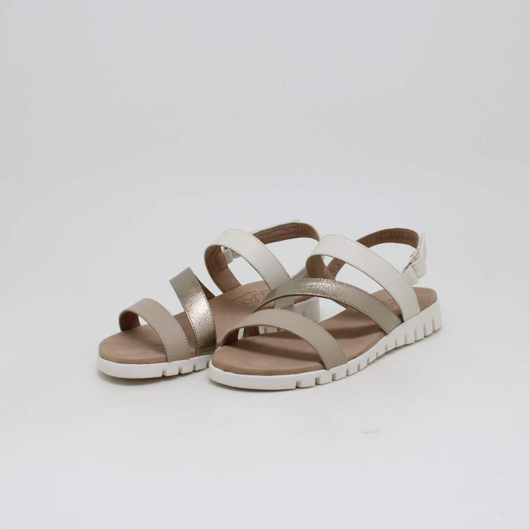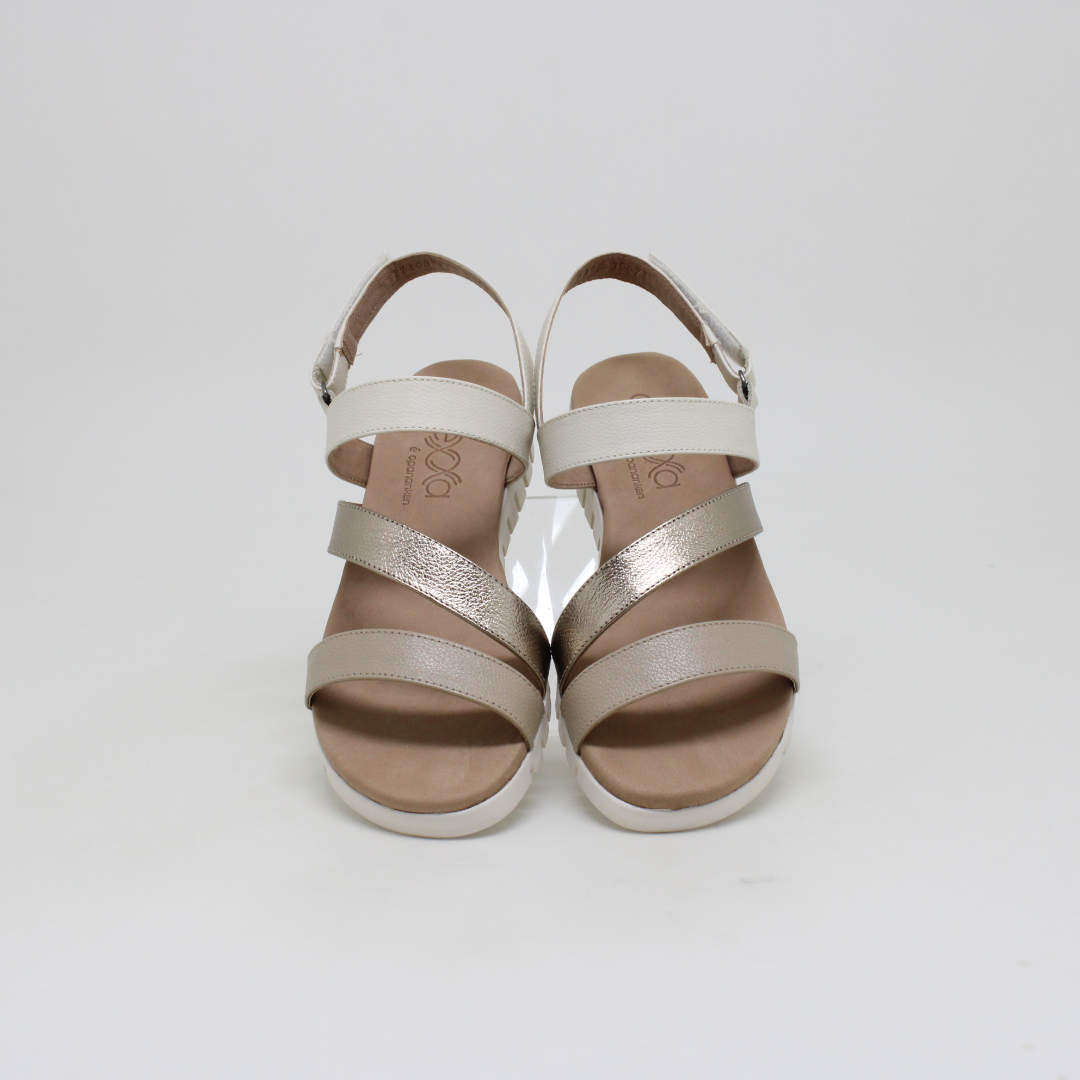 Sandália Opananken na cor amêndoa/prata velho, salto anabela baixo, confeccionado em couro legítimo muito macio. Forração interna toda em couro também. Calçado muito confortável.
